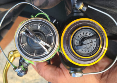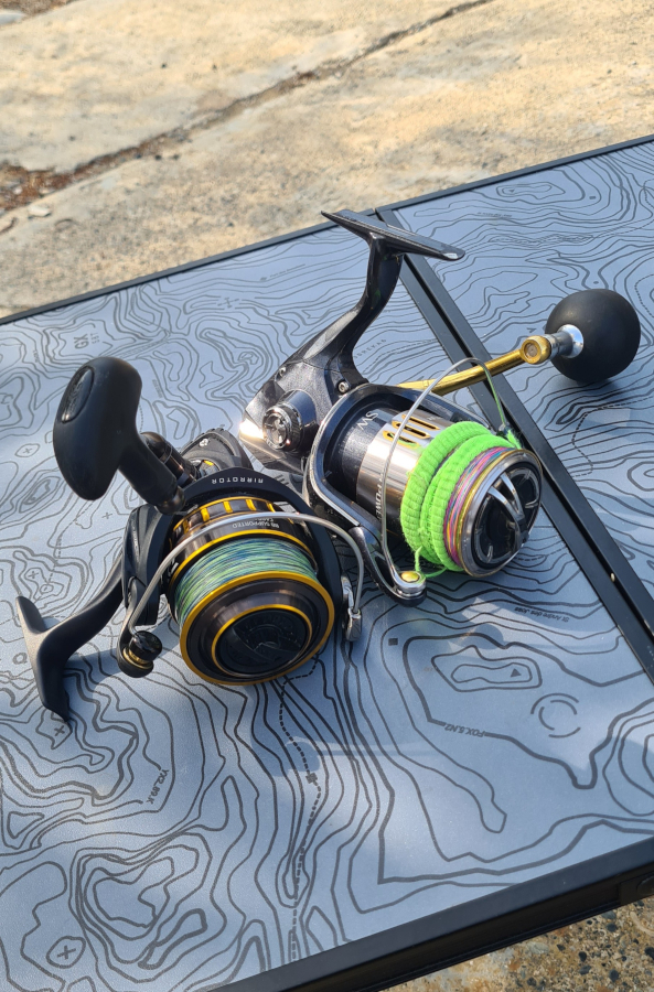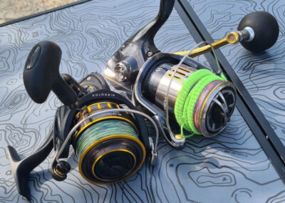 Einmal die SHIMANO TwinPower 4000 SW (alte Version) und die DAIWA BG 3000 (meine Ersatzrolle). Früher hatte ich die TwinPower in der Größe 5000, um etwas mehr Wurfweite zu bekommen. Aufgrund der gestiegenen Qualität der geflochtenen Schnüre, reicht mir die 4000er Größe. Die paar Gramm an Gewichtsunterschied merkt man am Abend nach einem langen Angeltag schon *lach.